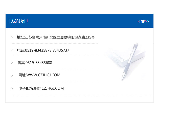 地址:常州市新北區友邦商務大廈1幢16、17層  電話:0519-85101652  傳真:0519-85112595  郵編:213022  網址:www_cz-jiayue_cn.chinayongrun.com  郵箱:xiajifengaa@163.com